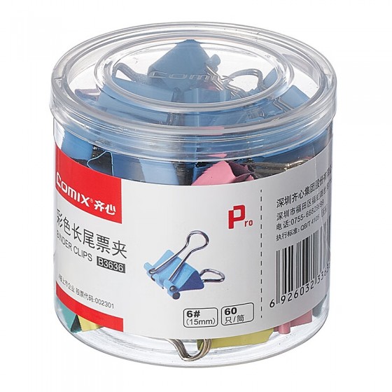 齐心 B3636 彩色长尾票夹 6#15mm 60只/筒