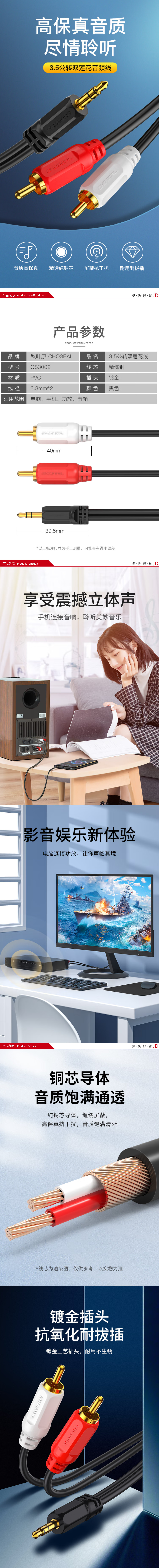 秋叶原(CHOSEAL)3.5mm一分二莲花头音频线QS3002T2