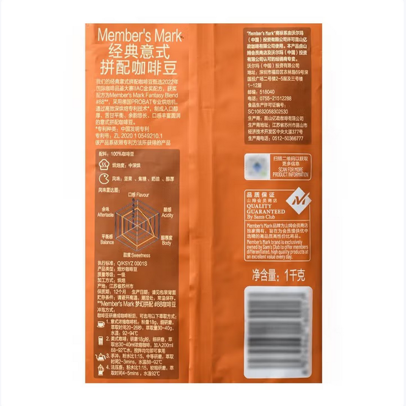 Member's Mark 经典意式拼配咖啡豆 1KG/包