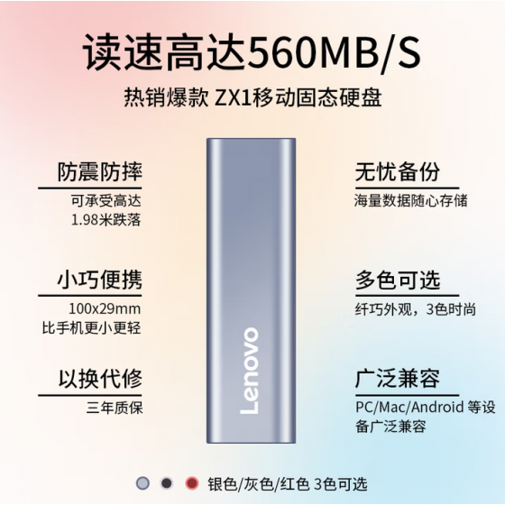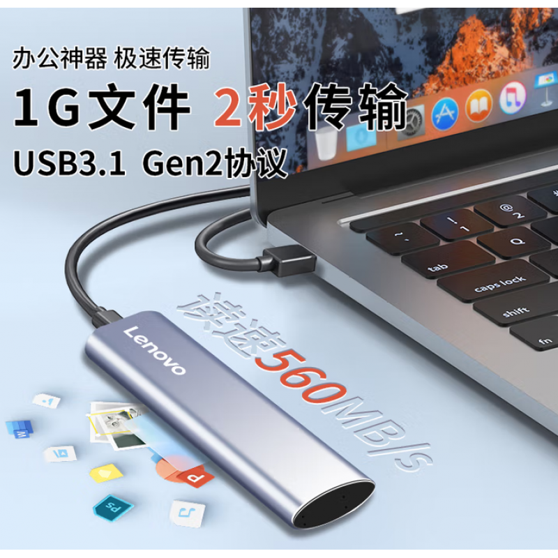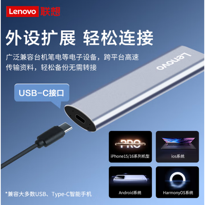 联想(Lenovo)2TB 移动硬盘固态(PSSD) ZX1 Type-c USB3.1双接口 读速560MB/s