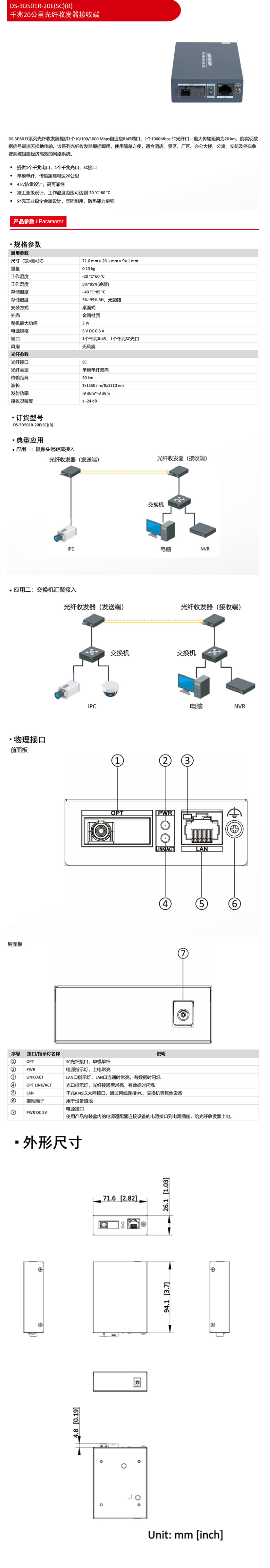 海康威视 千兆单模单纤光纤收发器接收端20Km(接收端) DS-3D501R-20E 2接口